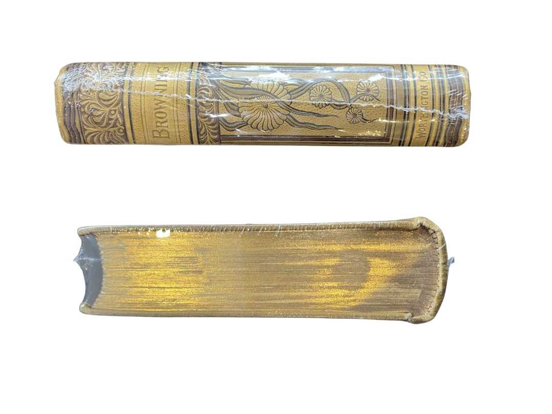 Browning The Poetical Works of Elizabeth Browning II Antique WORTHINGTON CO. Clear-Type Press The image shows an antique book, likely an edition of the poetical works of either Robert Browning or Elizabeth Barrett Browning, featuring a decorative Art Nouveau binding design. These mass-market editions were popular in the late 19th and early 20th centuries and often featured ornate cloth covers like the one pictured. Book Details Subject: The name visible on the spine and cover is “BROWNING”. Style: The intricate, flowing lines and stylized floral motifs are characteristic of the Art Nouveau movement prevalent in book design during that era. Era: Similar highly decorated Victorian bindings from the c. 1880s and 1890s are common among search results.The book features an ornate, Art Nouveau-style cover design with gilt and black floral details. It is a collectible item, often found in Victorian antique condition. Similar copies are part of a series of mass-market classical works from the era, known for their elaborate bindings. The text “BROWNING” is prominently displayed on the spine and front cover.