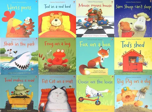 Usborne Phonics Readers 12 Books Collection Box Set Publisher: Usborne Publishing Ltd Publication date: January 1, 2020 Format: Paperback books in a box set Age range: Recommended for ages 3 to 5 (or 2-6) and early readers Content: A collection of stories that use rhyming and phonics-based text to help children learn to read. Included titles: Big Pig on a Dig Fat Cat on a Mat Fox on a Box Frog on a Log Goose on the Loose Hen’s Pens Mouse Moves House Sam Sheep Can’t Sleep Shark in the Park Ted in a Red Bed Ted’s Shed Toad Makes a Road