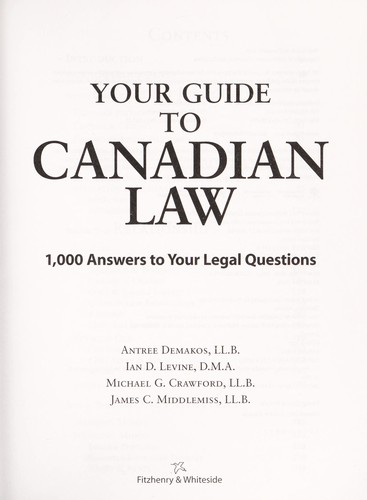 Based on real day-to-day experiences and the contributions of over 300 Canadian lawyers, this “best selling” book gives you everything you need to know about legal situations that we all encounter. No jargon, no theory, no maze of statutes – just clear and concise answers about the laws that matter most to you. Your Guide to Canadian Law is the perfect legal reference book for every home and business.–pg.[4] of cover.